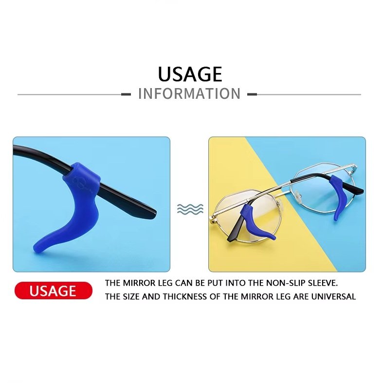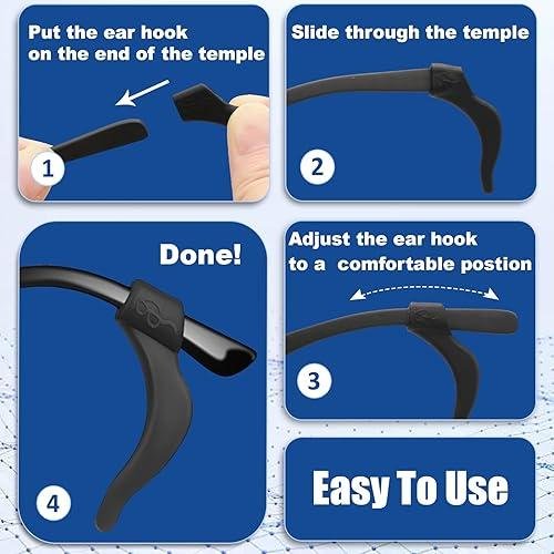 Ganchos antideslizantes largos para gafas fabricados en silicona suave que mejoran la sujeción y estabilidad.